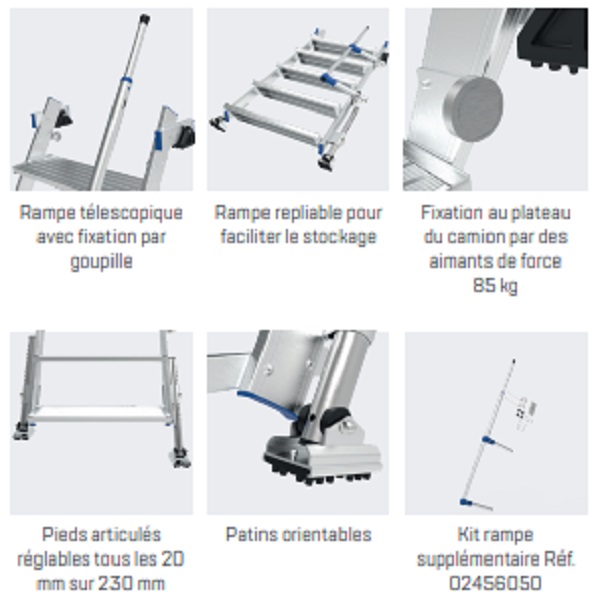 Die LKW-Zugangsleiter ist für den Zugang zu den verschiedenen Plattformen von Bau- oder Logistikfahrzeugen mit einer Höhe von 1,25 bis 1,49 m ausgelegt. Die Magnete mit einer Kraft von jeweils 85kg ermöglichen es der Leiter, sich sicher an der Ablage zu befestigen und die verstellbaren und gekerbten Füße geben eine wichtige Anpassungsfähigkeit und Stabilität.